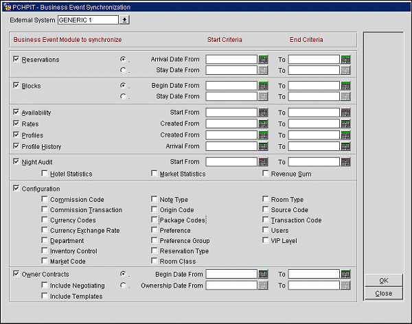 You can use the Utilities > Synchronize Utilities > Business Event Synchronization function if the license code is activated for OPP_BSEV Business Events and the appropriate external system (yield management, etc.). Business Event Synchronization provides you with the ability to capture or re-capture past business event data and has been implemented for upload to third parties.