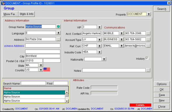The Profile screen is available from many points. For example, you can access the Profile screen by making a selection from the Profile Search screen, or by selecting the Profile button on the Reservation screen. The Profile screen differs somewhat depending on the type of profile you are viewing. (The type of profile you are working with is shown in the upper left corner of the screen.) The profile types are: