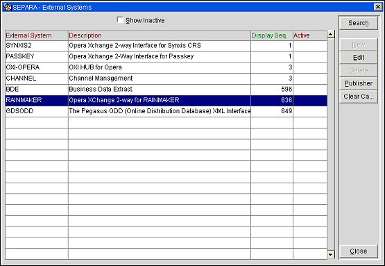 Show Inactive. Select to show only inactive external systems in the External Systems grid or unselect to show only active ones. This check box is unselected by default to show only active external systems.