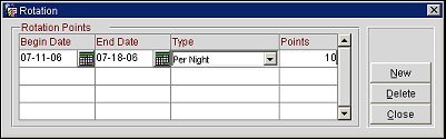 Rotation. Select the Rotation button access the Rotation screen and define rotation points for the selected unit. Select the begin and end dates for the period, the frequency, and the number points to grant for the selected unit. From the Elements screen, select the New button to add a new rotation period, the Delete button to delete existing rotation periods, and the Close button to return to the Rental tab.