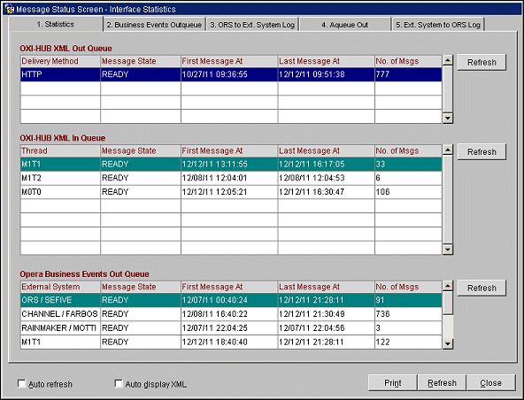 This screen displays all messages that have been generated from the ORS or OPERA PMS systems and their current status of being processed. The Statistics screen is broken into four areas for the users ability to see how the ORS or OPERA PMS’s business events are being processed. Also what the status is of those transmitted messages. (Sample screen shot above.)