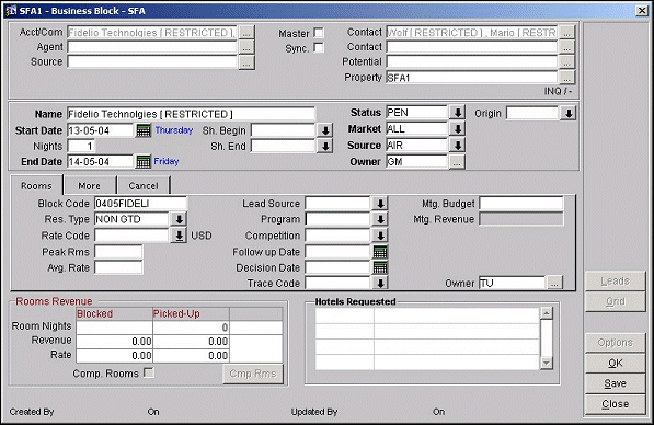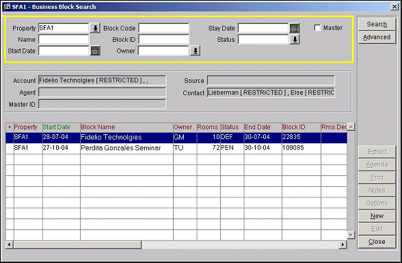 When the Business Block Search screen (BOOK_FIND) is displayed, all bookings are listed, according to the search criteria. However, you will only be able to view and edit those bookings for which you are an owner of both the account and the contact. Otherwise, when the restricted business block is highlighted, a [RESTRICTED] notation appears in one or all of the Account, Contact, and Agent fields, as appropriate. In addition, the Edit, Print, Extract, Notes, and Options buttons are unavailable.