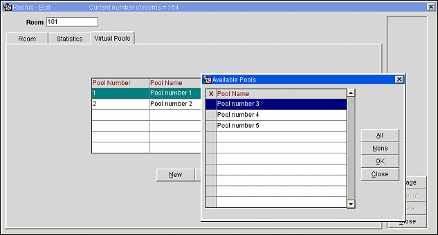 Select the New button to display the Available Pools list. The virtual number pools listed here depend on which pools have been set up for the property using the option System Configuration > Setup > Virtual Numbers. The Virtual Pools tab allows you to activate the required virtual number pools for the current room.